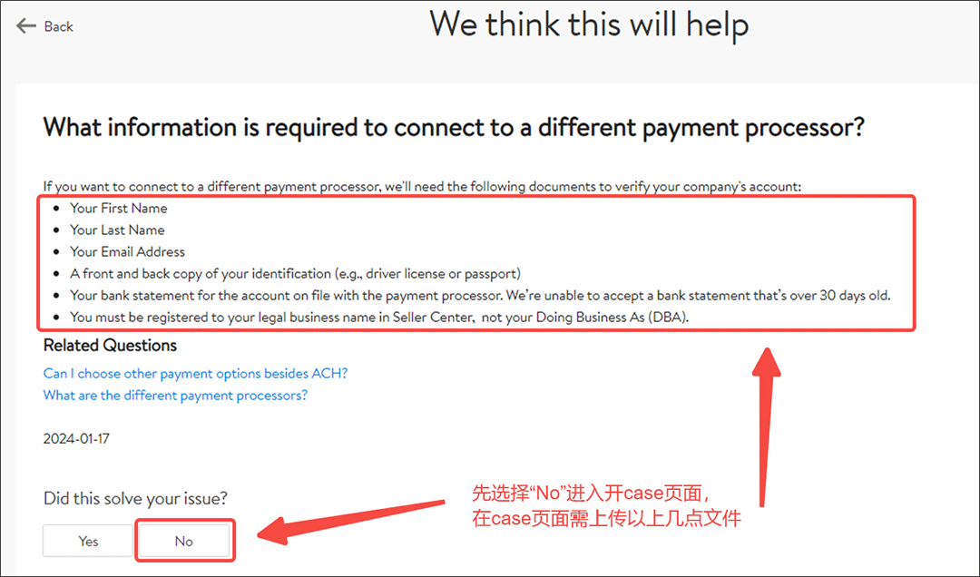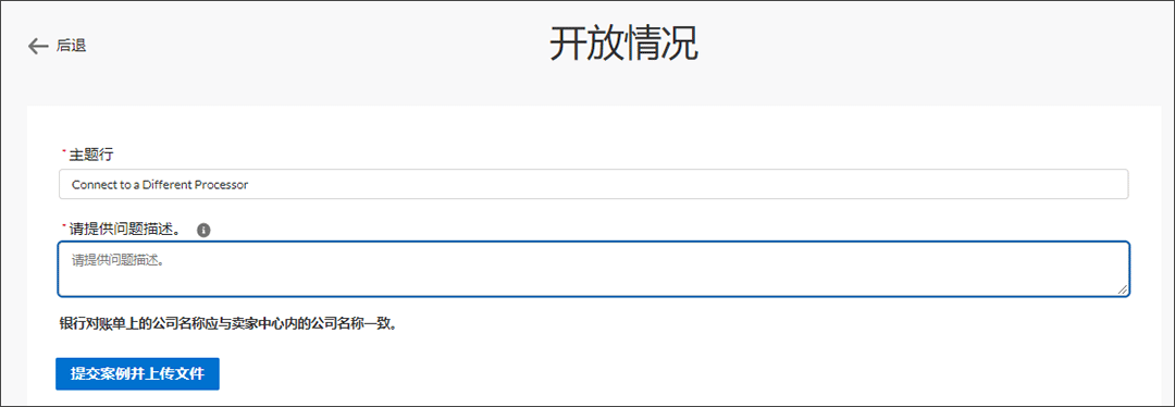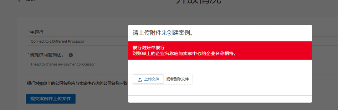 填写信息,请在描述中填写“I need to change my payment processor”,并上传文件。建议您准备以下文件并在该页面上传(具体所需换绑材料请以沃尔玛回复为准):