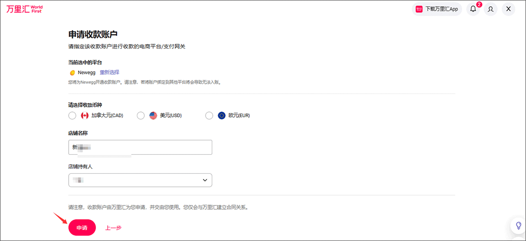 选择币种,备注店铺名称,选择“店铺持有人”,然后点“申请”继续